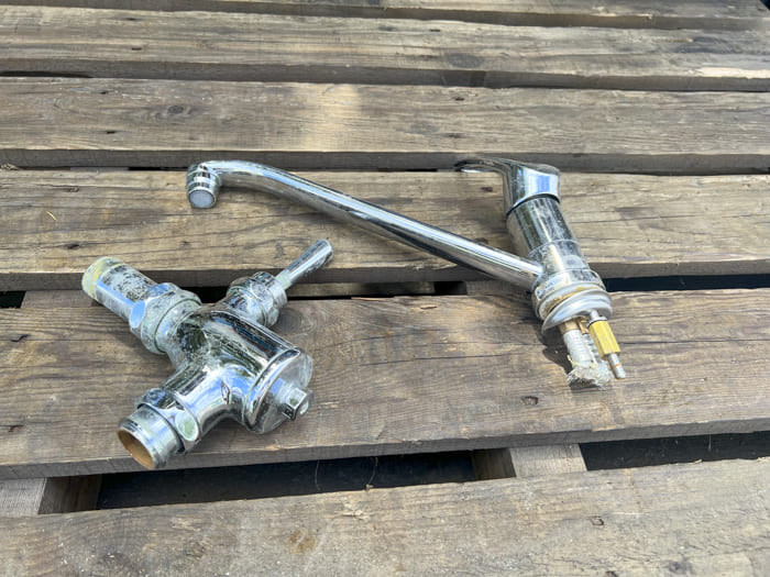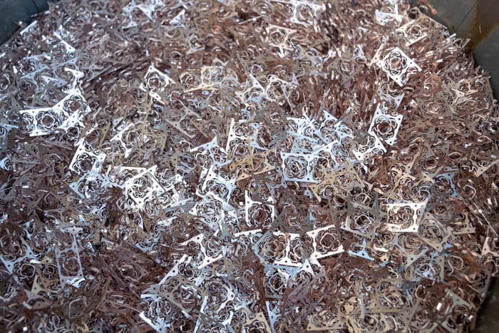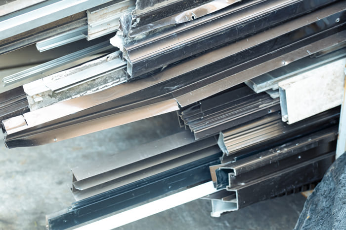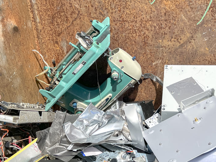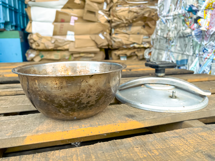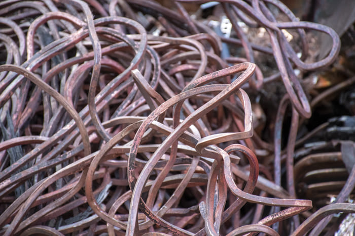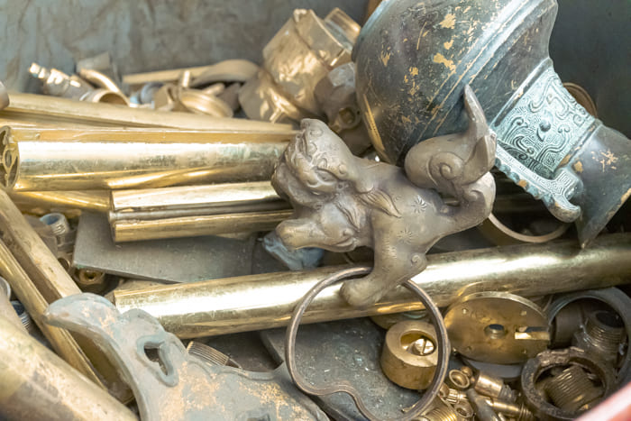 お客様より引き受けた金属製品。用途のために、様々な金属が様々な率で配合されています。リサイクルは、含まれる金属の種類ごとに丁寧に分ける作業が必要です。その後、適宜プレスなどをしながら、再生済の資源として高炉メーカー様や専用業者様に出荷します。