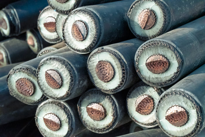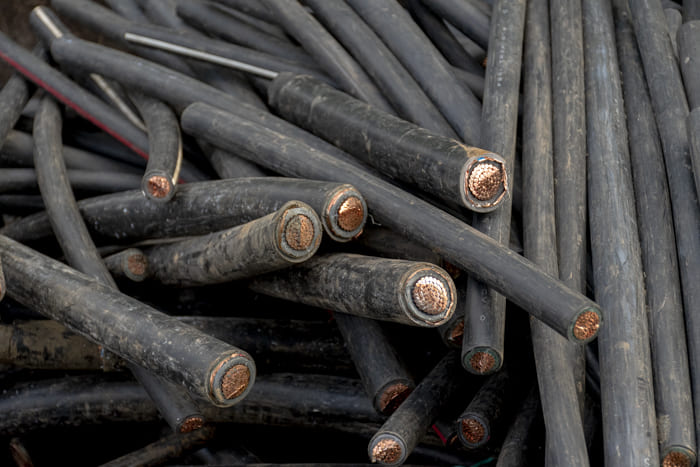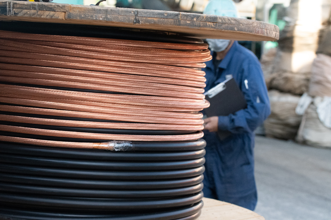 銅の導線の外側が絶縁され、「被覆線ひふくせん」と言います。特に、使用年数をこえた送電線は年間数十万トンも廃棄されます。